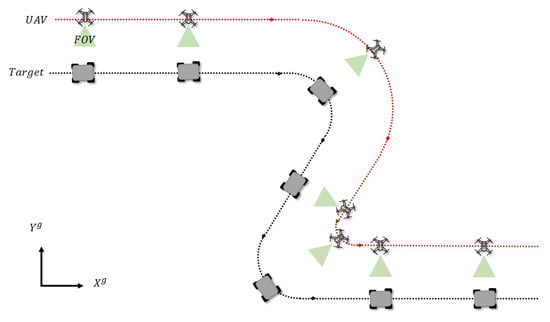 Dynamic targets: Knowledge of motion of targets is crucial in tracking control; however, the knowledge is unknown and difficult to predict, and so various forms of image features are used for feedback control as to keep the target in FOV [,]. Many image processing methods have been developed for feature extraction and matching, such as RGB-based methods [,], scale-invariant feature-transform (SIFT) [,], and speeded-up robust-features (SURF) [,]. However, there are some drawbacks for these methods in terms of object detection and estimation of the relative motion between the camera and the target. Visual-based optimization methods have been applied a quadrotor [], and it aimed to track a moving target while avoiding obstacles and the target position is assumed to be known in advance. Model-based optimization was applied to achieve perception and action objectives for robust sensing of a UAV []; however, the image features were extracted for indoor localization, rather than target tracking. Bounding boxes and feature points have been utilized as image features for tracking human beings [,,,], but the targets were moving at speeds that were so low that their motions could be ignored during tracking. Moreover, the orientation of the target is unavailable []. MPC has been applied to track a target moving along a periodic path, with this motion constraint reducing the complexity of the controller design []. However, the aforementioned works did not take the interaction between the target and the UAV into account, and the relative angle between the camera and the target was not modeled or measured.