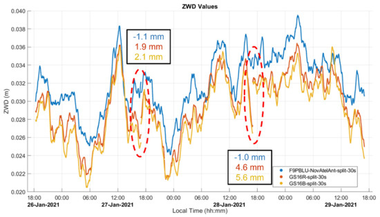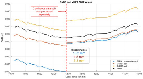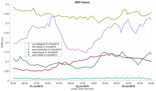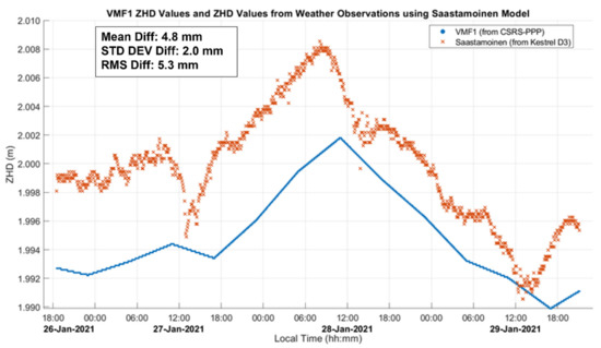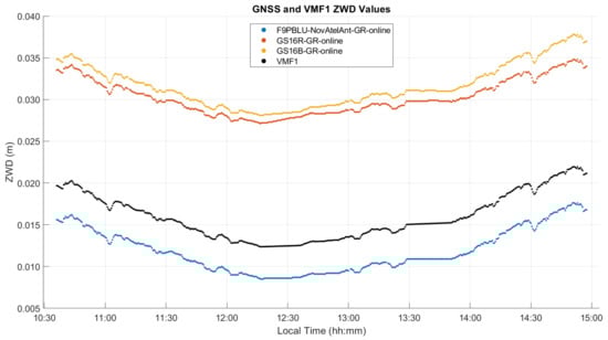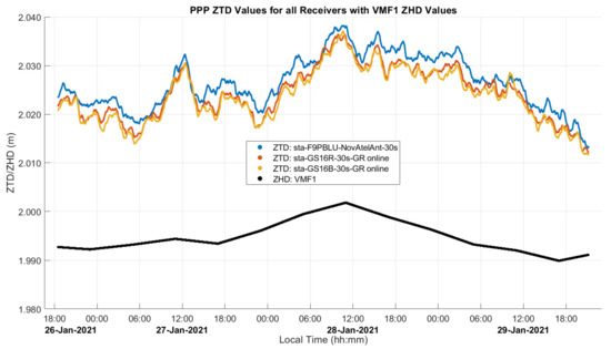 Static dataset A ZTD profiles produced by the three receivers used and VMF1 as initial condition in the software. The three profiles agree within a few millimetres. The ZHD estimated using only VMF1 with the PPP-derived coordinates is also shown; the 6 h update rate of VMF1 is evident. The difference between ZHD and ZTD is ZWD as shown in Figure 9. Local time is UTC−7:00.