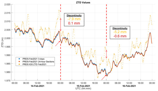 The three-day measurements were also split into three segments of 24 h to determine if agreement at the junction points is similar to that obtained with the IGS PRDS results shown in Figure 4. The results are shown in Figure 10. The differences for the three ZWD profiles range from −1.0 mm to 5.6 mm and are within overall expected ZWD profile accuracy as seen in the 2σ values of Table 1.