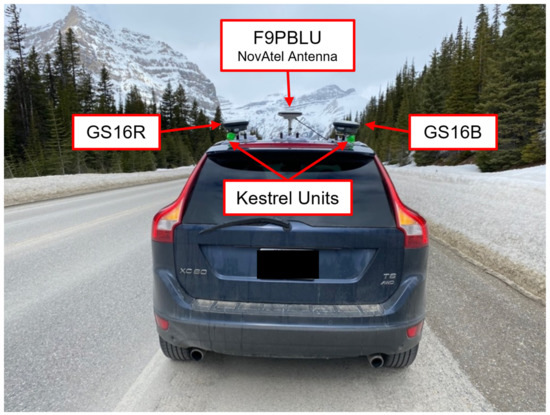Typical configuration of GNSS receivers for kinematic testing. The Leica GS16 receivers are seen mounted to the rear of the roof on the left and right sides. The NovAtel antenna is mounted to the front center of the roof, connected to the F9P unit located inside the vehicle. Kestrel environmental data loggers are mounted to the magnet mounts of the GS16 receivers. (Photo taken at the Bow Pass, 2100 m elevation on the Icefield Parkway on 28 April 2021).