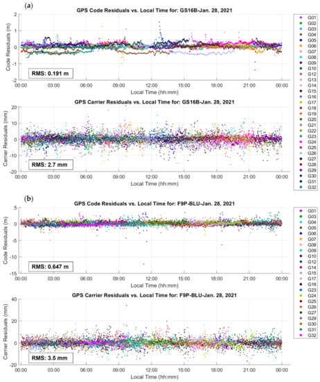 GPS L1 C/A code and carrier residuals of static PPP solution for 24 h of dataset A for: (a) GS16B receiver; (b) F9PBLU receiver using a NovAtel antenna. Vertical scales are different for each receiver. The F9P receiver shows fewer satellites as L2C is the only signal tracked in the GPS L2 frequency band; therefore, block IIR satellites (which do not broadcast the newer L2C signal) are not included in the dual-frequency PPP solution for this purpose. Local time is UTC−7:00.