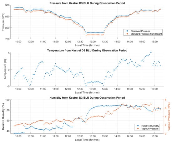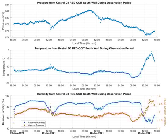Figure 7 shows the measured weather conditions at the site. Relatively stable temperature and humidity were observed until the last 12 h on 29 January when the temperature rose by 10 °C. Temperature increases of this type are common in Calgary due to Chinook winds (the equivalent of Föhn in the Alps), which occur when humid winds blow from the Pacific Ocean east over the Rocky Mountains as described by [14]. The rapid increase in elevation forces cloud buildup on the windward side, combined with rapid temperature decrease, resulting in precipitation over the mountains. The condensation of clouds into precipitation releases latent heat into the air, resulting in a warm wind on the leeward side of the mountains into Calgary and the surrounding area. During this 12 h period, the relative humidity dropped as the saturation point increased with temperature, despite the simultaneous increase in absolute humidity (water vapour pressure). Pressure observations changed of up to 7 hPa during the multi-day test period.