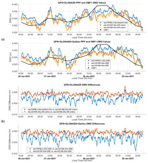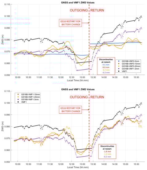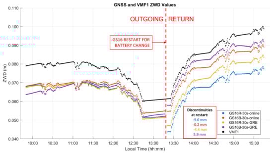 Figure 9 shows the ZWD profiles estimated by PPP and VMF1 for both GR and GRE solutions, with ZWD ranging from 20 mm to 40 mm. These values are expected for such a cold winter day at an elevation of over 1000 m. Predictably, the use of three constellations versus two under such open sky conditions does not change the results significantly. The mean difference between GR and GRE solutions is 0.5 mm, with a standard deviation of the difference of 1.7 mm as shown in Table 1. The trend of the PPP-derived profiles is in close agreement with the VMF1 one, the mean difference between the GS16B and VMF1 being less than 1.5 mm and its standard deviation of 3.45 mm as shown in Table 1. The main contribution of GNSS measurements processed in PPP mode in this case is therefore the higher frequency variations which depart from VMF1 by up to about 10 mm.
