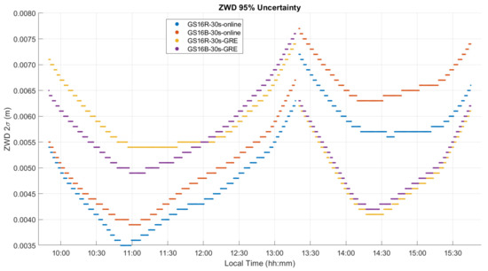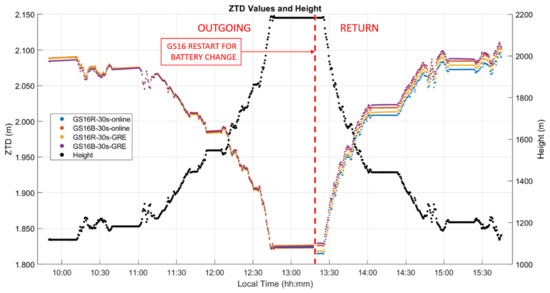 The ZTD differences between receivers are the same as those for the corresponding differences between ZWD values shown in Figure 14. The corresponding statistics for ZWD and height differences are given in Table 3 and Table 4. The GPS integer ambiguity resolution success rate ranges from 72% to 93%, a significant decrease as compared to the static case. Integer ambiguity resolution success rates for GRE solutions on the outgoing trajectory are shown as 0.00% in Table 3; this is likely due to the precise products used in GRE processing (GFZ orbit and clock products/CNES observable specific biases), not the addition of Galileo. This effect was investigated by processing GR solutions for the outgoing trajectory using GFZ ephemeris, which also resulted in zero integer ambiguity resolution success. The mean 2σ values are the averaged 2σ values output at each epoch by the software for the entire test. These values are largely determined by the process noise in the PPP filter. However, they are also affected significantly by the short duration of each data sequence. This is shown in Figure 15, where, predictably, the lowest uncertainties of 3 to 4.5 mm are in the middle of each sequence where the smoothing has maximum effect. The uncertainties at the extremities reach 7.7 mm. Nevertheless, this stability also shows that sufficient measurements with appropriate satellite geometry were available during each segment. The discontinuities of the ZWD profiles after the receivers are restarted at the pass range from −0.2 mm for the GS16B to 9.6 mm for the GS16R. The discontinuities for each solution are of different magnitudes and in different directions, eliminating the possibility that there is a consistent systematic effect on all solutions. These initial discontinuities remain nearly constant during the return trajectory, resulting in a mean difference of 11.2 mm between the GS16R and GS16B receivers on the return trajectory, as given in Table 3, versus the mean difference of 1.5 mm on the outgoing trajectory. If one considers that the 2σ estimated ZWD accuracy of one profile is 6 to 7 mm prior and after the data interruption, the maximum difference of −9.6 mm shown in Figure 14 is within the limit of the 2σ values of the difference between the two profiles. This shows the accuracy limit of PPP-derived ZWD kinematic profiles under the type of conditions encountered during the test. Dataset C will confirm the same level of performance.