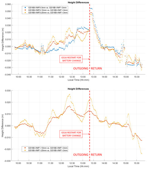As seen in Figure 14, the ZWD profiles estimated by PPP closely follow the VMF1 profile, resulting in a standard deviation of 1–2 mm in the difference between the GS16B and VMF1 profiles. To ascertain that VMF1 used initially as input to CSRS-PPP does not overconstrain the output of the latter, the GS16B measurements were re-processed with different ZWD models. Using the developmental PPP software with the same GR constellations and precise products as the online version, solutions were computed with a priori ZWD values of zero (denoted as VMF0) and process noise of 3 mm/√hr (identical to the online software), 10 mm/√hr, and 20 mm/√hr. The developmental software was also used to obtain solutions with the VMF1 a priori ZWD model as carried out in the online version (denoted as VMF1) but with the above 3 mm/√hr, 10 mm/√hr, and 20 mm/√hr process noise. ZWD profiles for all of the above solutions are shown in Figure 16, with statistics of differences with the online solution given in Table 5. The baseline results when using the VMF1 a priori model and 3 mm/√hr process noise are identical to the GS16B online solution shown in Figure 14. For solutions not using the VMF1 a priori ZWD values, it is evident that with 3 mm/√hr process noise, there is no significant correlation in ZWD with height as is seen in the VMF1 model and solutions computed using the VMF1 a priori values. However, when the process noise is increased to 10 mm/√hr, the ZWD profile reacts to changes in height somewhat similarly to the VMF1 model. The changes are much smoother than solutions which use the VMF1 a priori model, as the sharp variations in these solutions are produced by the height corrections for VMF1 grid values to the receiver height derived by [18], as mentioned earlier. When the process noise is increased to 20 mm/√hr, the variation increases further compared to the solution using the VMF1 a priori model. At several points, the 20 mm/√hr solution changed in the opposite direction as was expected for the given height change, e.g., at the periods beginning at 11:15, 12:00 and 14:30 local time. In the first two cases, the receiver height increases, causing the VMF1 model to decrease; however, the estimated ZWD increases. In the third case, at 14:30, the same effect is seen, with the height change occurring in the opposite direction. To determine if this variation reflects actual ZWD variation or if it is simply random instability, the same analysis was performed on the GS16R receiver. The deviations from the VMF1 height corrections of the GS16R results occurred at different times, in different directions and with lower magnitudes. Additionally, the GS16R profiles showed stronger correlation with the height correction variations. As the variations between the two receivers were not similar, it appears that the deviations from the height corrections used in the online solution are more likely to be random instability than true ZWD variations. Therefore, while the ZWD solution variations are strongly constrained to the height corrections applied to the VMF1 model in kinematic mode, it does appear that the height correction method is appropriate and maintains stability in the ZWD solution. The height differences between solutions without an a priori ZWD model and the online solution shown in Figure 17 reach over 50 mm, which is similar to the level of height 2σ uncertainties shown in Table 4. Even when the VMF1 a priori is used in all solutions, the differences with the online solution reach over 25 mm with different process noise; therefore, the impact is significant on PPP kinematic positioning capability at that level of accuracy.