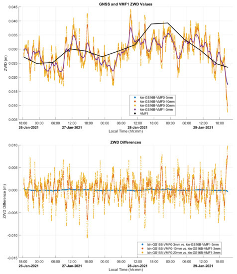 In the analyses presented in the following sub-sections, the estimated ZTD and ZWD profiles are both provided. This is because the main contribution of GNSS measurements is in the estimation of the ZWD component and its correlation with height errors, while the ZTD is shown to provide context for the magnitude of the ZWD relative to the total tropospheric effect. GNSS measurements contribute to the ZHD components through providing positions and heights to VMF1 for which an accuracy of a few metres is sufficient. The estimated ZHD profile is therefore identical for receivers operating within several metres of each other as carried out here. As mentioned previously during the discussion of Figure 3, ZHD errors occur when the actual atmospheric pressure at the receiver is different from the interpolated values from the VMF1 grid. ZHD modelling errors cause errors in height estimates due to the difference in satellite elevation angle mapping functions for ZHD and ZWD parameters as described by [11]. The magnitude of ZHD errors in the dataset analyses is estimated by comparing the ZHD profile obtained with the pressure measurement profile obtained at the receivers using the Kestrel unit with Saastamoinen’s model and the corresponding VMF1-derived ZHD profile. These errors are somewhat compensated for in the ZWD estimation process. While this compensation preserves the positioning accuracy of the PPP solution, it is detrimental to the ZWD parameter accuracy itself, if it were to be used for numerical weather prediction purposes.