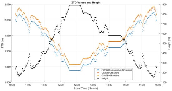 The estimated ZTD and ZWD profiles of this static test are shown in Figure 8 and Figure 9, and comparison statistics are summarized in Table 1 and Table 2. The 2σ uncertainties of the derived profiles are those provided by the PPP software. The GPS and Galileo ambiguity resolution success rate is above 94% in all cases. The three-day continuous measurements were processed as one solution for each receiver. Figure 8 shows the three estimated GR ZTD profiles and the modelled ZHD profile used in the solution as obtained by VMF1 through PPP as discussed previously for Figure 3. The ZTD profiles range from 2.012 to 2.038 m.