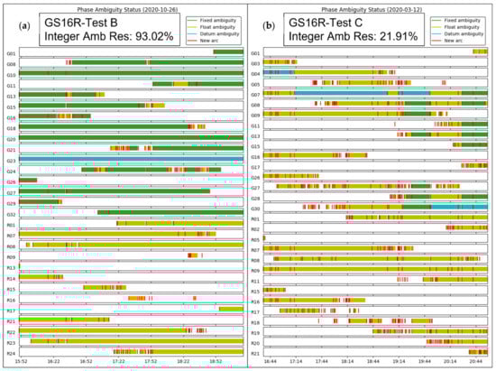 Ambiguity status plot from CSRS-PPP solution report from GS16R solutions for kinematic tests B outgoing only-(a) and C (b). Time shown is UTC.
