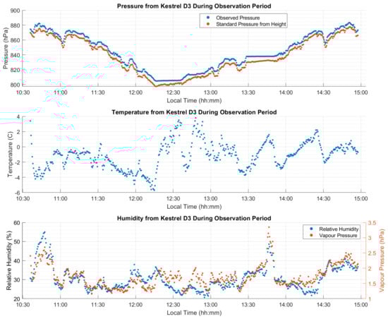 Kinematic dataset C atmospheric measurements made on the vehicle during the test. Measured atmospheric pressure was 3 to 9 hPa higher than standard values. Water vapour spiked at 13:30 local time due to a brief snowfall. Local time is UTC−6:00.