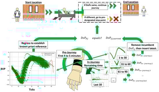 First, historical data of the subject was defined as known priori of his/ her normal condition. For AHBT, supervised and authorized PPG measurement was taken for 5 min just prior to the start of autonomous journey, hence pre-fixed as pre-journey (PJ). These quantifications had taken into consideration of both operational needs and statistical requirement as PJ phase should not be too short where waveforms per dataset would fall below statistical significance under central limit theorem (N = 30). Second, immediate measurement was defined as obtained information of patient immediate wellbeing. Specifically, they were the latest, continuous and non-overlapping sets of 30 PPG waveforms during AHBT travel towards its destination, hence pre-fixed as in-journey (IJ). Similarly, 30 PPG waveforms per IJ dataset were required for statistically significant data in the shortest possible time.