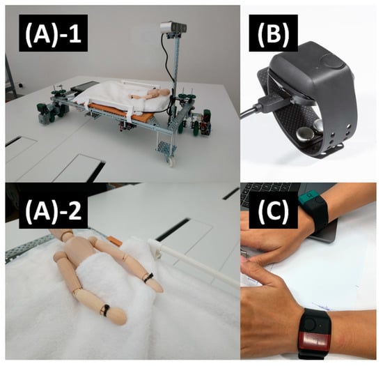 Scale down model of an autonomous hospital bed transport prototype was designed and tested. It included a set of motorized caster wheels and various autonomous navigation elements (A-1). Prototype mockup of a patient wearing PPG wristbands on both wrists simultaneously (A-2). Example of both PPG wristbands worn simultaneously on both hands of a subject using Empatica E4s (Empatica Inc., Boston, MA, USA) (B,C).