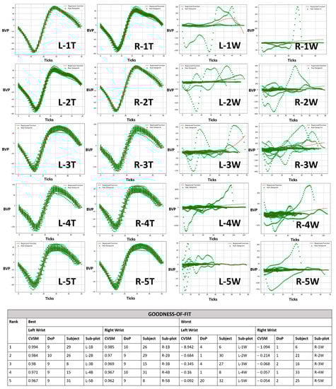 The worst five PJ datasets were consolidated between near-zero to small magnitude negative CVSM at 18th to 20th DoP, as shown in the W subplots under Figure 3. This was due to mandatory PR ML modelling at sub-optimal DoPs. In particular, (L-1T, L-2W), (R-2T, R-1W) and (R-3T, R-3W) PJ subplot pairs in Figure 3 showed best and worst CVSM instances coming from the same subject’s PJ dataset. The proposed ML algorithm had demonstrated that it would only pick out the best goodness of fit outcomes.
