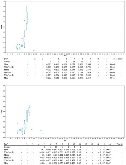 CVSM spreads were greater in IJ datasets as compared to PJ datasets, as shown in Figure 7. This was due to a lighter dataset definition of 30 PPG waveforms coupled with natural signal artefacts resulting in CVSM extremity potential, as discussed earlier in Section 3.1. This was much less in comparison to PJ dataset definitions, which on average comprised of 400 waveforms based on nominal 80 bpm heart rate within a 5 min measurement window. Nonetheless, higher CVSMs, especially 0.50 and above, were possible with at peak DoPs, between 8th and 11th DoP.