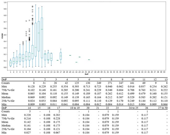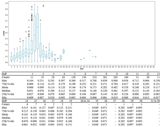 In this study central tendency served as an analysis on whether algorithm was stable or not. Ideally, only one mode should be associated with the highest goodness of fit to reduce uncertainties in algorithm decision making. Visually, this should be seen with a single peak DoP distribution in contrast to multiple peaks across DoP domain, as shown in Figure 5. For PJ datasets, single peak DoP would mean convergence of the subject’s known priori across a statistically significant group. For IJ datasets, a single peak DoP convergence coinciding with PJ’s DoP peak would mean high algorithm efficacy. Moreover, CVSM spread per DoP from Figure 6 to Figure 7 served as indication on level of data accountability where the ideal was for tight CVSM grouping with large number of occurrence and high mean at DoP distribution peaks. Every occurrence of peak DoP value would be a good validation of high algorithm stability across the population.
