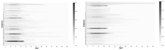 Heatmap distribution of PJ DoP by each subject for all 35 subjects. Left wrist (left) and right wrist (right).
