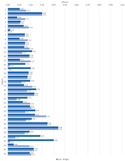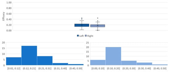 Efficacy spreads for each wrist (top). Efficacy distributions left wrist (bottom-left) and right wrist (bottom-right).