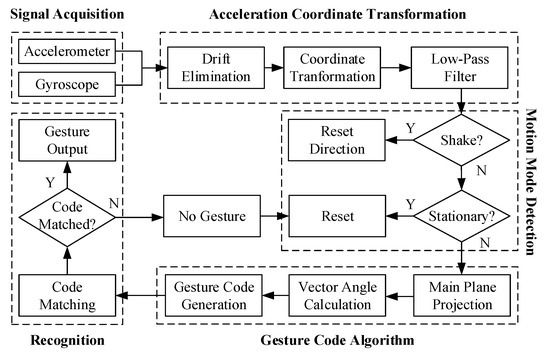 Based on the axis-crossing code mentioned above, a hand gesture recognition algorithm is implemented in this section. It is composed of five procedures: (1) signal acquisition, (2) acceleration coordinate transformation to the world frame, (3) motion mode detection, (4) gesture code generation, and (5) recognition by template codes. The pipeline is shown in Figure 3. The accelerometers and gyroscopes measure signals generated by hand movements in the wristband. For experimental purposes, they can also be sampled by any other inertial modules and collected as a dataset for the PC to perform the evaluation. The other processes will be described in detail below.