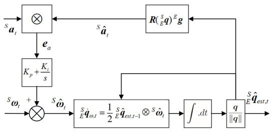Our task in this procedure was to estimate . We utilized the quaternion-based complementary filter (CF) to estimate the rotation information [28,29]. That was done to design a closed-loop control system based on the frequency complementarity characteristics of the accelerometer and gyroscope, to estimate the attitude of the sensor carrier in the form of a quaternion. The implementation is shown in Figure 4.