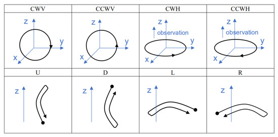 We made templates for eight gestures: vertical clockwise circle (CWV), vertical counterclockwise circle (CCWV), horizontal clockwise circle (CWH), horizontal counterclockwise circle (CCWH), up (U), down (D), left (L), and right (R). The trajectories of the eight gestures are shown in Figure 5, and the corresponding gesture codes are listed in Table 2.