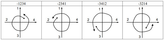 We label the four pivotal axes as 1, 2, 3, and 4 in turn and make the following conventions: when the vector passes through the quadrant axis in a clockwise direction, the number of the quadrant axis is taken as a positive label; when the vector passes through the quadrant axis in a counterclockwise direction, the number of the quadrant axis is recorded as a negative label. In this paper, we define four-digit identification codes, i.e., recording the last four labels. Marking the labels as c1, c2, c3 and c4, respectively, the calculation rules of the gesture recognition code are as follows: