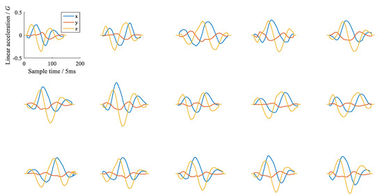 We used all the samples to train the DTW recognizer and tested it with the same data. The recognition accuracy of the three template selection methods is listed in Table 3. The average recognition precision shows that the min-intra and max-inter/intra are similar, and both are better than the min-intra and max-inter methods. This is not in line with our intuition because according to [19], the min-intra and max-inter method are at least not inferior to the min-intra method. We think the reason lies in the complexity of circle gestures due to different starting points and orientations. Figure 8 shows 15 CWV gestures, all of which have different starting points, and their orientations are uncertain. We can intuitively see that the waveforms of the same gesture have significant distinction, so the standard deviation of the intra-class distance would be substantial, resulting in the extreme inaccuracy of the min-intra and max-inter method. In fact, the significant distinction between samples within the same class is also the main reason for the low accuracy of the DTW algorithm, no matter which template selection method is used. We chose the min-intra method as the representative of the DTW recognizer to further compare the accuracy and the consumption of computing time.