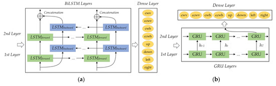 Architectures of (a) RNN–BiLSTM and (b) RNN–GRU.