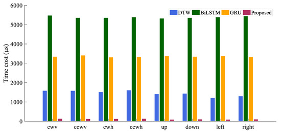 Table 6 presents the comparison of the accuracy of all four HGR algorithms, in which BiLSTM, GRU, and the proposed algorithm all have high recognition accuracy. DTW has the worst accuracy, which has been discussed in Section 5.1. At the same time, the proposed algorithm gets the best accuracy. When considering time consumption, as listed in Table 7, the two RNN algorithms show significant disadvantages. The histogram in Figure 10 provides an intuitive expression of this substantial difference in time cost. It can be seen that among DTW and RNNs, accuracy and time cost compose a trade-off problem: higher accuracy requires more computing time. But our algorithm dramatically reduces the balance point of the trade-off problem. While maintaining high precision, the time cost of our algorithm is only 7.6%, 2.0%, and 3.3% of DTW, BiLSTM, and GRU, respectively.