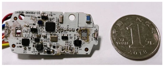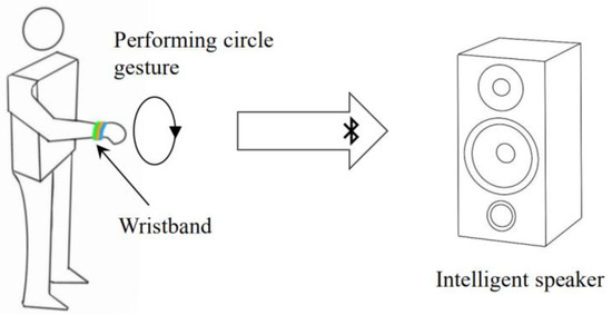 We implemented our algorithm on a small circuit board integrated with a Cortex32 M0 chip and IMU module, as shown in Figure 11. The device is as small as the size of two coins and can be fixed on the wrist without external equipment. Figure 12 shows how users interact with the intelligence speaker using our wristband. The user can perform either large or small circle gestures, and the wristband can quickly complete the recognition task online. The recognition result is directly transmitted to the intelligence speaker and its lighting components via Bluetooth to emit different sounds and light colors. The computational resource requirements are as low as Flash < 5 KB, RAM < 1 KB. The maximum battery consumption is about 13 mA × 3.3 V.