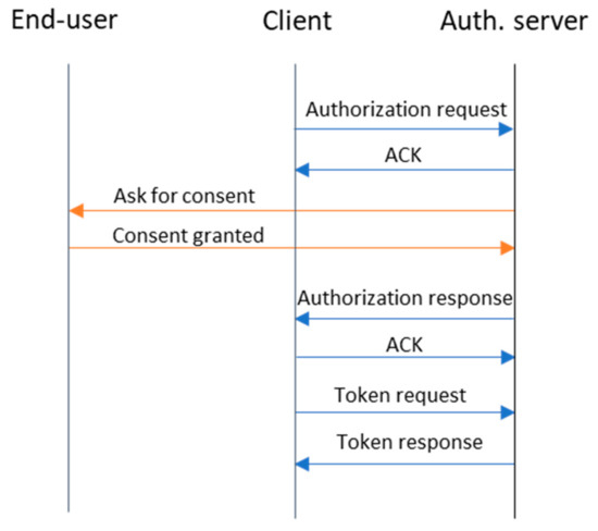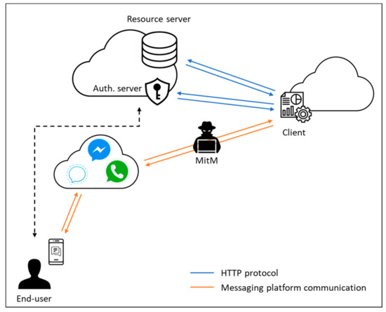 Figure 3). It was designed to be used with client profiles that use messaging platforms as user-agents to deliver services. In this new grant type, the authorization server is able to interact with the end-user using the same interface (user-agent) that he is already using to interact with the client, i.e., the messaging platform. Messaging platforms do not support any kind of redirection mechanism, which is crucial in the Authorization Code grant type defined by the OAuth standard. These redirections have a double function: to allow the client to pass the required information to the authorization server (and the other way) and to allow the authorization server to directly interact with the end-user (to ask them for their consent). As can be seen in