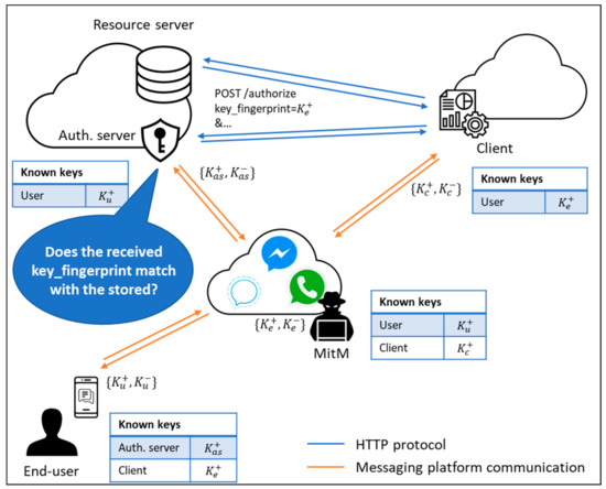 In such a scenario, the MitM would be able to see and modify messages exchanged between the end-user and the client, while the authorization server has no way of detecting his presence if no additional measures are applied. The use of the key_fingerprint parameter in the authorization request of the proposed protocol is intended to sort out this situation. When the client starts the authorization process, the fingerprint of the attacker’s public key () is included in the request, since the client has been cheated into thinking that this public key actually belongs to the end-user. When the authorization server receives the authorization request, it is able to compare the fingerprint of the received public key () with the fingerprint of the public key that it has stored for the end-user () as a result of the authentication ceremony. Any time that a MitM appears between the end-user and the client, the public key fingerprints will not match, and the authorization server would be able to detect its presence before issuing any access token.