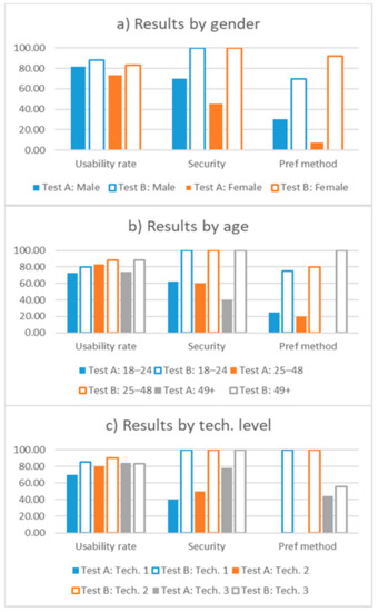 Figure 6c, which shows the results depending on the technical abilities of the participants. In this figure, occasional users are labeled as tech. 1, habitual users as tech. 2, and advanced users as tech. 3. The more experienced participants rated the usability of method A higher than others with less experience. A larger number of experienced participants also trusted method A to be secure compared with participants in other groups. Finally, all the participants that preferred method A over method B were advanced users. Some insights derived by this study may be conditioned by the limited number of participants, and a study addressing this concern would be needed to confirm our findings.