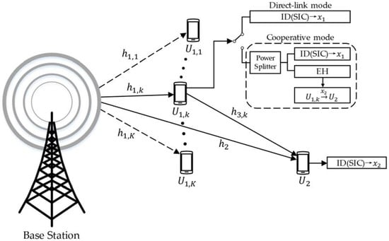 In the constructed system model, , , and are the channel fading coefficients of the link, the link, and the link, respectively. and are both equipped with single antennae and use successive interference cancellation (SIC) technology to decode the demanded signals and . The BS functions as a signal-transmitting source. Since is closer to the BS, it could perform as an energy harvester and a cooperative relay. On the other hand, as the far user, the signal receiving quality of is worse. Thus, two modes of network situations are shown in Figure 1, i.e., direct-link mode and cooperative mode, to ensure the communication quality of the network.