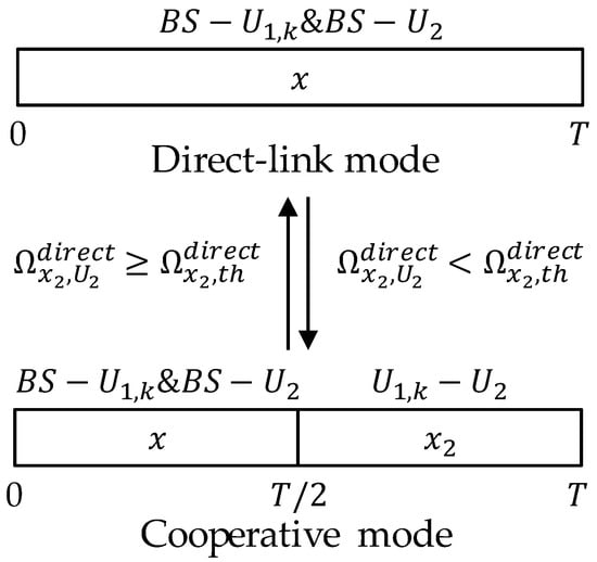 To obtain optimal system performance, a feasible should be selected. In direct-link mode, the standard to achieve near-user selection is that the channel gain of the link should be optimal compared with others. Compared with direct-link mode, an extra link in cooperative mode should be considered. Based on the partial relay selection (PRS) scheme [32], we prioritize the optimal channel gain of the link so that ’s power for forwarding signals and communication quality with the BS can be ensured, which is the premise of cooperative communication. Thus, the standard for optimal near user selection can be expressed as
