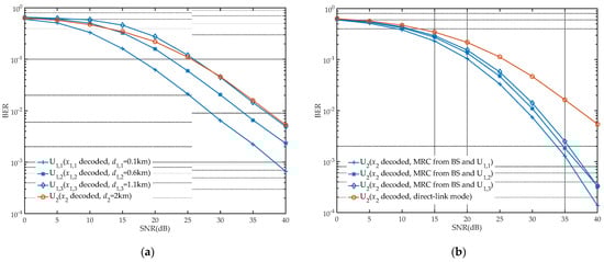 Figure 3 shows the decoding performance of and in different modes. In Figure 3a, for near users, it can be seen that the BER is affected by the distances between users and the BS, which gradually increases with the lengthened distance and is even worse than that of in low SNR, referring to . This is due to the utilization of SIC technology, where more energy is allocated for the signal required by . To decode the required signal , has to inevitably face the interference of residual . Adding the distance influence, the decoding performance of is unsuitable to be a part of the proposed networks. From Figure 3b, it can be observed that could achieve higher performance gain in cooperative mode than in direct-link mode, where MRC is exploited in to obtain extra gain of from . As analyzed in Section 3, the premise of ensuring forwarding quality is the higher performance of link communication. Considering the transmission requirements of communication distances, the link is the optimal performance communication link, which verifies the feasibility of the PRS scheme from the perspective of decoding performance.