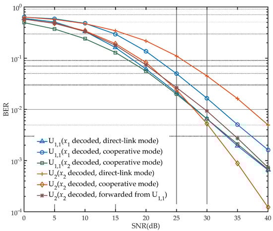 Under the condition of user selection, Figure 4 summarizes the decoding performance of and in two modes. The performance of to decode in direct-link mode is similar to the performance of decoding in cooperative mode. This is due to the influence of residual when is decoded in direct-link mode and additional loss caused by power splitting of in cooperative mode. However, the decoding performance in these two cases is better than that of decoding in cooperative mode, which experiences power splitting and information decoding and is affected by losses of both the above. From the perspective of the transmission link, the BER performance of receiving through link transmission is also presented. Since only is transmitted, for a single link, the far user only decodes , and there is no redundant interference, so its decoding performance can be an order of magnitude higher than decoding in direct-link mode under high SNR conditions. Through MRC, the performance of decoding is improved and is even better than that of others when the noise impact is sufficiently low. Overall, it should be noted that the decoding performance of the total network is not ideal because of the imperfect SIC (a difficult decision in decoding, which leads signal detection error) in actual simulation.