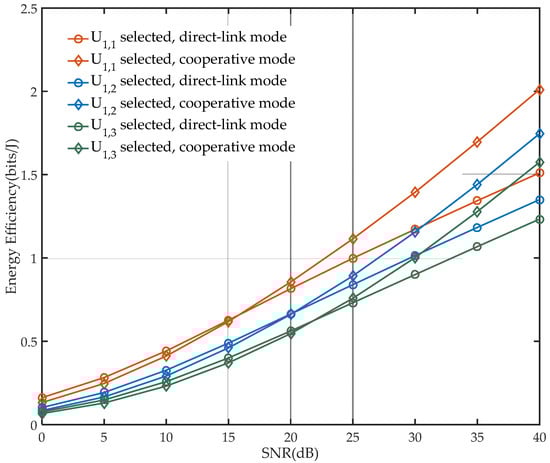 As shown in Figure 5, when the SNR is low, the EE of the network in direct-link mode is higher than that in cooperative mode. This is due to the fact that the achievable rate of transmitted from the cooperative relay under the condition of low SNR cannot make up for the achievable rate of after power splitting in the relay. Considering the fading led by the increased distance, should be selected for better EE performance, and the network could receive cooperative EE gain in a lower SNR compared with other selections.