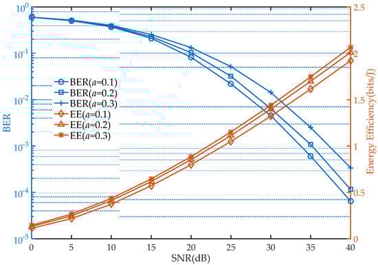 To analyze the comprehensiveness performance of the system, the energy efficiency of the network under different modes and user selections is presented in Figure 5, and the BER and EE performance in the different BS power allocation factor is shown in Figure 6.