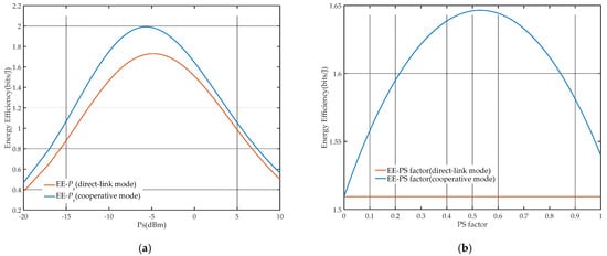 Influence curves of different parameters on EE: (a) BS transmission power (, ); (b) relay PS factor (, ).