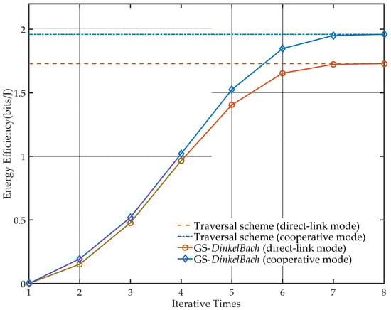 As can be seen in Figure 8, the GS-DinkelBach iterative algorithm and the traversal scheme are compared to prove the convergence of the proposed algorithm and the accuracy of the results. Through the algorithm, the EE reaches an optimal value through eight iterations in direct-link mode and cooperative mode. With the increase in iteration times, the EEs of the two different modes both gradually converge into stable values. Comparing the GS-DinkelBach algorithm with the traditional DinkelBach algorithm, the computational complexity of the proposed algorithm is , while the computational complexity of the traditional DinkelBach algorithm is . The algorithm proposed in this paper has lower computational complexity, and the superiority becomes more significant as the number of searching steps of increases.