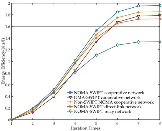 The purpose of the simulation in Figure 9 is to compare the EE performance of different system models. It can be seen from Figure 9 that the NOMA–SWIPT cooperative relay network proposed in this paper has performance advantages, of which the EE composed of the same parameters is higher. As the iteration increases, the differences between EE performance in different models become more obvious.