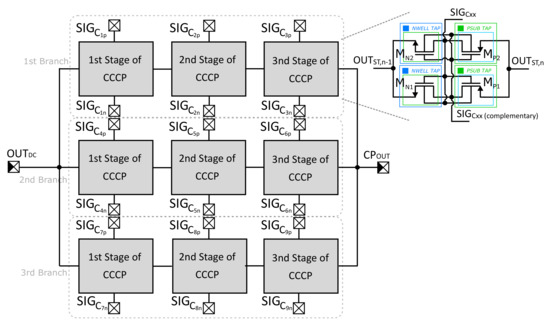 The most important part of the proposed converter is the CP Core (Figure 2). This block consists of nine cells organized into series-parallel configuration creating an unconfigurable structure with three parallel branches (multi-branch structure at higher system level). Each branch consists of three CP cells connected into a cascade. In the ideal case, cascading cells allows boosting the CP Core input voltage up to , where N is the number of cascaded stages. This can be achieved if supplying the CP core as well as the driver by the same voltage value. However, non-ideal CPs have many parasitics that deteriorate performance such as the finite output impedance including modulation index and parasitics capacity at switching nodes, etc. [17,18,19]. Under low-voltage subthreshold conditions and the high current throughput requirement (see RF-harvester application in Section 3) across the system, the output impedance plays a very important role and should be minimized as much as possible. In this sense, we would like to state the following: