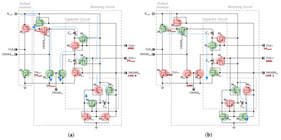 Consequently, the proposed CP consists of a stand-alone boosted driver circuit to solve the above-mentioned issue as an alternative to other competitive techniques with different primary purposes in relation to ultra-low voltage research area (e.g., a clock booster based driver, topology reconfiguration approach, implementation of adiabatic principle and many others [10,24,25]. The transistor level schematics of the proposed driver and detailed cross-connection with a complementary replica circuit are shown in Figure 3 and Figure 4, respectively. The implemented driver originates from an already characterized version (presented in [26,27]), which was extended by another auxiliary circuit in order to further improve the performance of the boosted output inverter. The previous version boosts the gate of the high-side part of the inverter formed by PMOS transistor to the negative voltage of −. The low-side part was of our interest and, therefore, kept untouched. Despite this implementation, the driver has been successfully implemented into a chip prototype of regulated DC-DC converter and is capable in driving more than 100 pF capacitor with a few units of propagation delay under the supply voltage value of 200 mV and the clock frequency of 1 MHz [26].