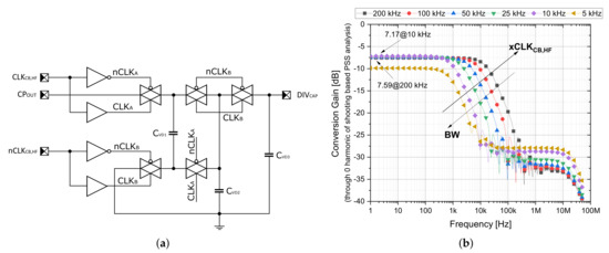 The high-frequency branches are directly fed from the external clocks and drive transmission gates (TGs) in the capacitor-switching voltage divider across fast drivers and inverters (designed as type 1 in top-level block scheme, Figure 1). The main objective of this step is to eliminate static power consumption and exploit a greater inherited compactness compared to bulky resistors with higher resistance value. The proposed voltage divider of type 1 is shown in Figure 5a, where capacitors can be arranged by TGs connected into a serial-parallel cycling reconfiguration. Due to the fact that capacitors and are of the same size (capacitance of 15 pF), the ratio of ≈0.5 is provided at steady state. However, if a dynamic- technique is employed together with quite large TGs ensuring reliable on-state under low-voltage conditions ( 400 mV, = 250–300 mV/300–350 mV for long/short channel, respectively, in a standard 130 nm CMOS technology), the dominant parasitics effect such as charge injection and clock feedthrough cannot be fully neglected. Additionally, the dynamic bulk-switching fosters discharging effects that degenerate the dividing ratio (the issues of low frequency). For these phenomena, the post-extract simulation (PEX) under the nominal conditions reveals 92–224 mV of variation in DC value, where for 25 kHz and 50 kHz driving frequencies, the best results of 193.4 mV and 210.3 mV are achieved, respectively. Figure 5b shows the conversion gain transfer function of the to node through zero harmonic obtained from the PSS-PAC type analysis. The achieved results demonstrate slightly lower ratio around −7.4 dB in comparison to the intended value of −6 dB. With a link to time-based analysis observations, the non-negligible influence of parasitics effect can be deduced. Adding the filtrating capacitor with the capacitance value of 40 pF at the output node, the capacitor-switching voltage divider is obtaining a character of first order low-pass filter with frequency-dependent corner frequencies of the 1 kHz–20 kHz range related to clocks and , which is the characteristic property of many other systems utilizing the switching capacitor technique. Since the divider and control logic are necessarily supplied by the high-voltage domain (i.e., ), the use of the clock booster or level shifter auxiliary circuits must also be a part of the design. In other words, the low-voltage domain (supplied by the input voltage ) must be able to control the high-voltage domain and ensure its reliable operation. For this purpose, the popular Nakagome’s clock booster with dynamic- technique was employed [20,28].