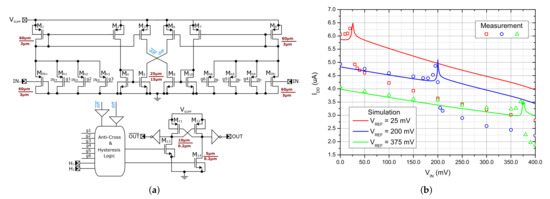 The divided voltage is compared to the reference voltage generated externally, and a suitable control signal at node is produced (see Figure 1). The decision block providing this task is a rail-to-rail voltage comparator depicted in Figure 6, which has been designed for the power supply voltage of 400 mV with emphasis on the robustness and low value of the input offset without the need of post-processing trimming [29,30]. The topology is capable of working with even lower supply voltages thanks to two stacked transistors. The proposed comparator works in the so-called current regime. The input transistors act as current sources modulated by the input voltage applied to their bulk terminals. The current generated in the input branches is then mirrored in order to create the differential voltage in nodes and , which is then processed by digital block. The proposed comparator topology also contains built-in programmable hysteresis controlled by a 2-bit input signal. The hysteresis does not require any external components and its level and symmetry can be fully custom-designed by the ratio of the respective transistors. The enable function shuts-off the current sources, sets the output to a defined logic state, and reduces the power consumption into a leakage level. For this purpose, the level has been selected to allow passing the clock signals into the driver, which in this application ensure a reliable start also at a very low supply voltage. The selected measured characteristics are displayed in Figure 6b, where the measured current draw includes the consumption of several ESD structures, IC package, PCB and probe parasitics. This means that for on-chip application, the power consumption can be considered near or even less then 1 µW under typical conditions, which can be improved by further reduction of the supply voltage.