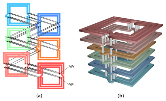Designed OCA of the implemented EH (turn details: width = 60 µm, space = 12.5 µm; realized using top 6 layers. (a) Two-dimensional structure. (b) Three-dimensional structure.