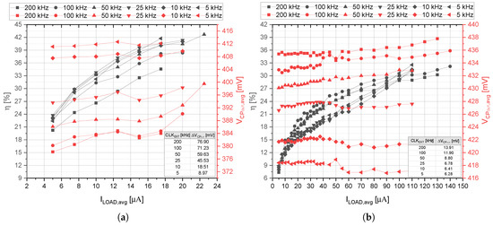 In Figure 9a, one can observe the dependence of the efficiency () and the output voltage () of self-powered CP system on the output load current () for different external clock frequencies () and the input voltage value of 180 mV (the minimum value needed to start-up the self-powered CP system). It can be observed that the maximum efficiency can be obtained for a low clock frequency and for the maximum current at the CP output. For these conditions, the efficiency of about can be achieved. However, the output voltage deviates by about from the required value (400 mV). For higher clock frequencies, the CP system has a higher power consumption; therefore, the overall efficiency is degraded. The optimum clock frequency is about 50 kHz, where the efficiency and the output load current of 43% and 23 µA were achieved, respectively. As can be observed from Figure 9a, if the input voltage is increased to the value of 300 mV, the output current over 100 µA can be reached. In such a case, the efficiency of the self-powered CP system is less dependent on the clock frequency. It is also important to mention that the deviation of the output voltage of the CP system is mainly caused by the on-chip voltage divider, because its voltage ratio depends on the clock frequency as already discussed in Section 2.3.