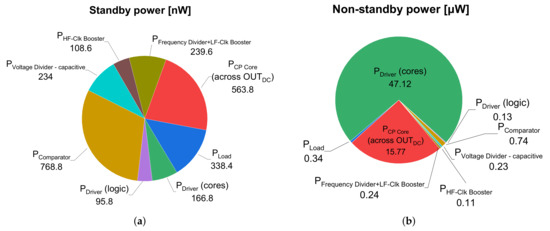 The stand-by power consumption and non-stand-by power consumption of the CP system are shown in Figure 10, where the total power consumption was divided into the contribution of individual sub-blocks of the overall CP system. Naturally, the biggest part of power consumption in the non-standby mode is given by CP Core and Driver cores that directly drive the bulky flying capacitors across charge transfer switches and boosted inverter, respectively. Other sub-blocks consume less than of total power consumption. In the standby mode, all parts have a power consumption in the order of hundreds nW, while the biggest part of contributors to standby power is given by the comparator used in the feedback control loop across its permanent current-bias and leakage current through bulk diodes (a natural drawback of bulk-driven design technique).