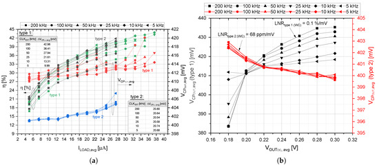 Dependence of the output voltage on the input voltage is depicted in Figure 11b, where one can observe that the output voltage is independent of the clock frequency in the case of the resistive voltage divider. Additionally, the load regulation (LNR) in the worst case is 68 ppm/mV. Therefore, in order to obtain better output voltage regulation, it would be proper to use the resistive voltage divider. From the efficiency and the output load current point of view, the performed analysis show better performance in the case of using the capacitor-based voltage divider. However, such a divider should be carefully optimized for the selected clock frequency and parasitics effect in order to obtain desired output voltage regulation.