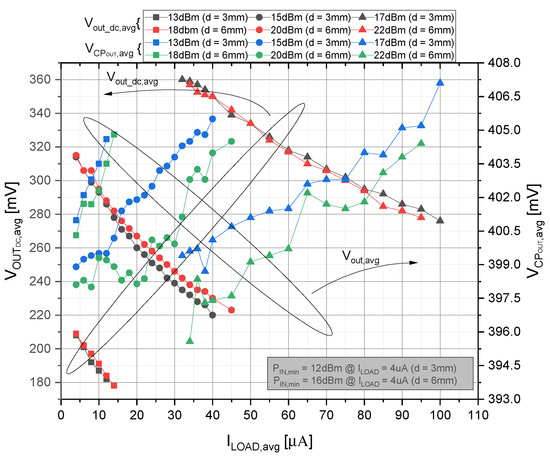 Figure 12 shows the dependence of the CP output voltage (and the output voltage from the on-chip RF rectifier) on the load current at the output of CP system. The presented measurement results are obtained for the distance of 3 mm and 6 mm between the external antenna and the on-chip one for different values of the input power. The average output voltage from the rectifier is shown on the left y-axis (), while the regulated output voltage from the self-powered CP system is introduced on the right y-axis () of the graph shown in Figure 12. If the distance between antennas is increased twice, the input power has to be increased by 5 dBm in order to obtain the same voltage level at the RF rectifier output. The minimum input power needed for a reliable start-up of the self-powered CP system with the minimum load current (4 µA) is 12 dBm and 16 dBm for 3 mm and 6 mm distance between the external and on-chip antennas is required, respectively. The regulated output voltage from the self-powered CP system was set to 0.4 V, and we can observe from Figure 12 that the system can reliably regulate the output voltage to the required value with the accuracy of . Naturally, with higher input power, one can achieve a higher value of the output load current. Regarding the CP system itself, the efficiency was not influenced. On the other hand, the efficiency of the overall CP system including the RF energy harvester will be significantly less than 1%. Such a low efficiency is primarily associated with the quality factor of the on-chip inductor and with the effective chip area in addition to degrading effects (described in [31]).
