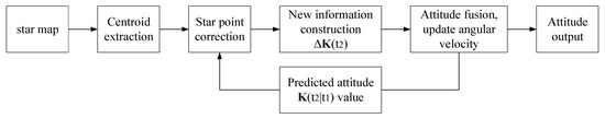 Therefore, a high-update-rate attitude measurement algorithm for star sensors based on star point correction is proposed in this study. The proposed algorithm combines the continuous motion attitude recursive estimation and the corrected star point measurement information to obtain attitude information at different moments in a single frame of the star map and update the attitude multiple times during the exposure time. The proposed algorithm makes up for the problem of no posture information within the exposure time under the traditional global exposure mode. A block diagram of the proposed high-update-rate attitude measurement algorithm is shown in Figure 3. The characteristic matrix obtained by recursive estimation is defined as and the characteristic matrix constructed by the new star point information after correction is .
